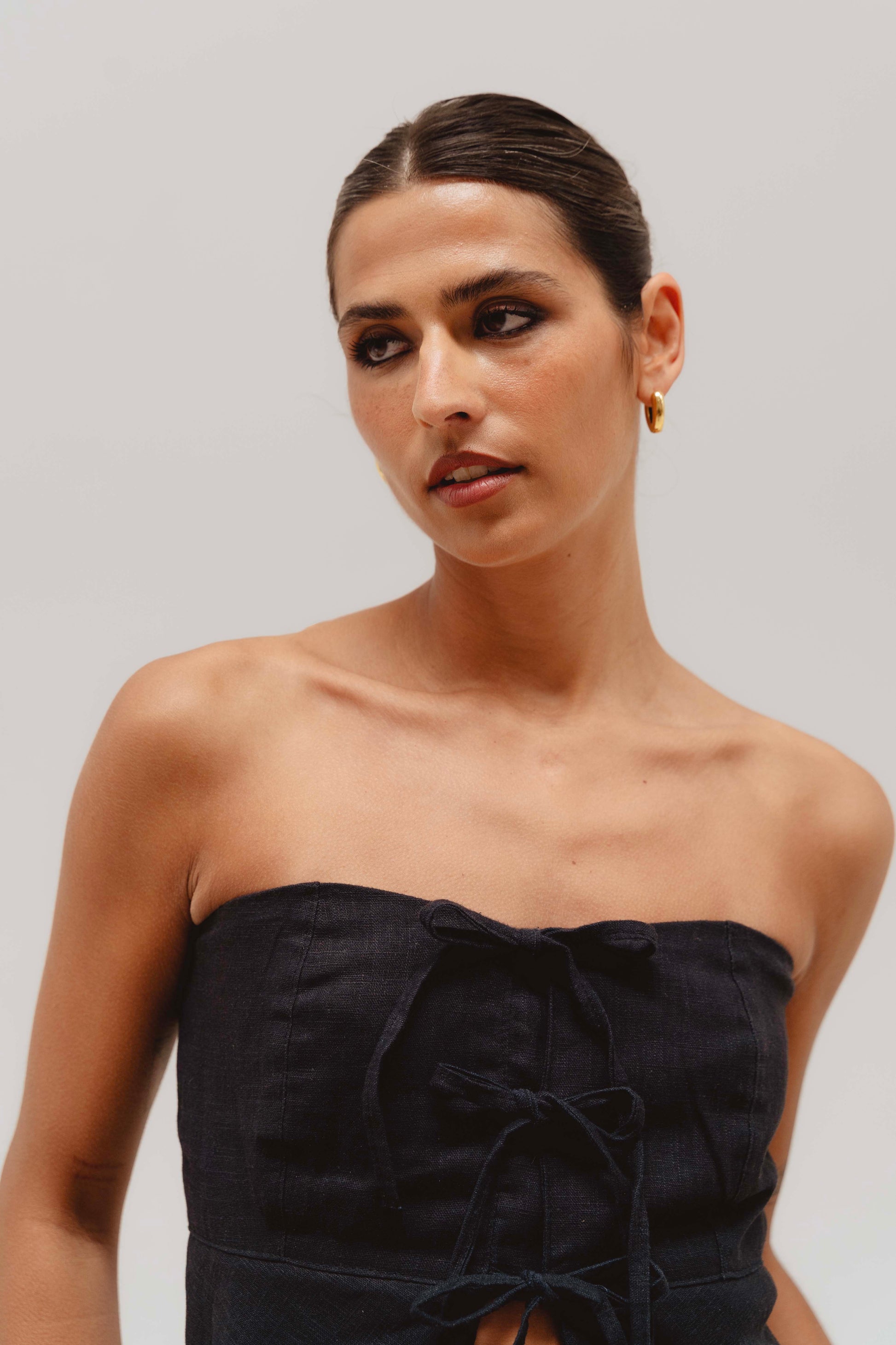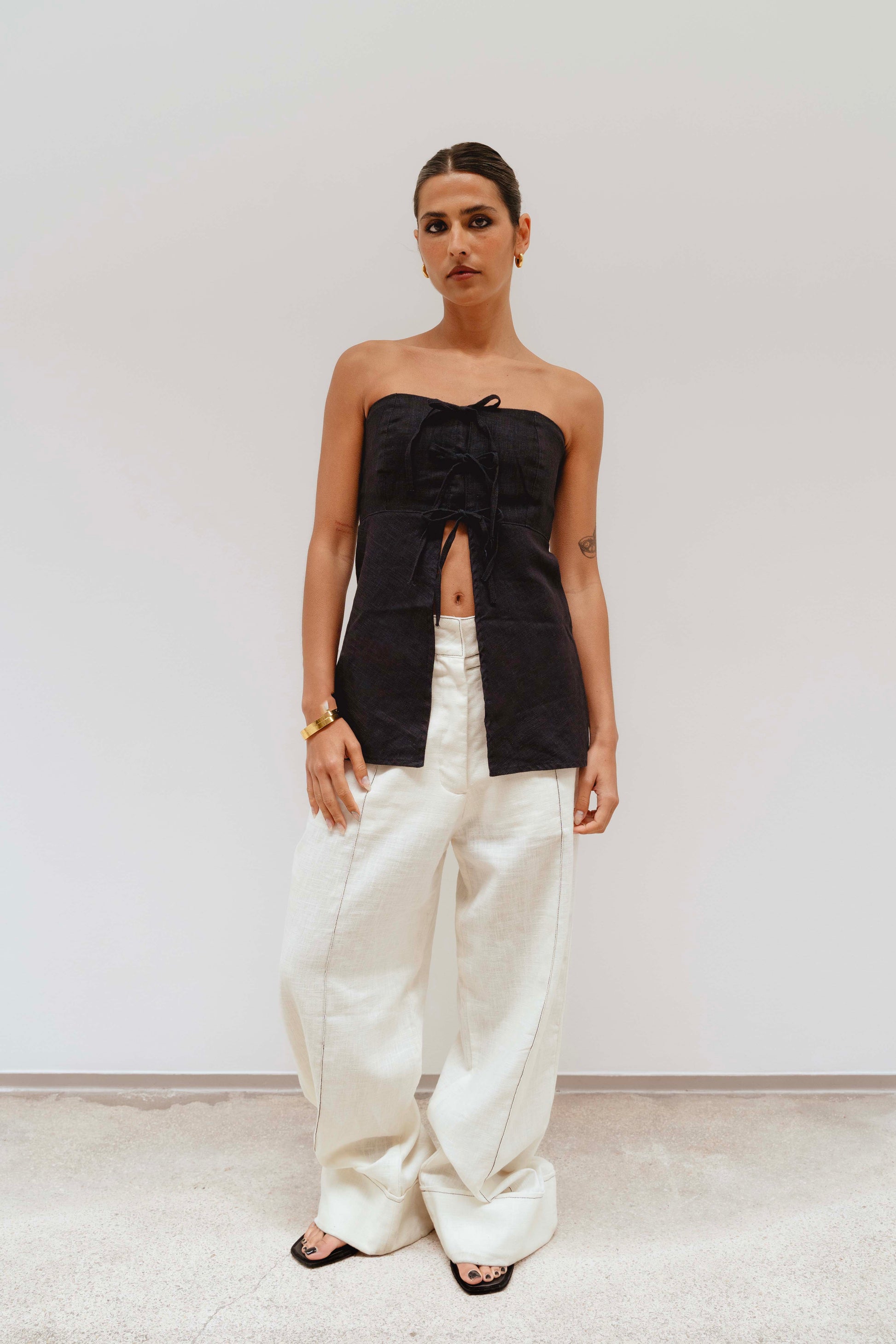 The SAUDADE TOP boasts an anatomically-shaped chest area for unparalleled comfort. Its sleeveless design showcases a combination of white fabric and black stitching, complete with three ties for securing the neckline.